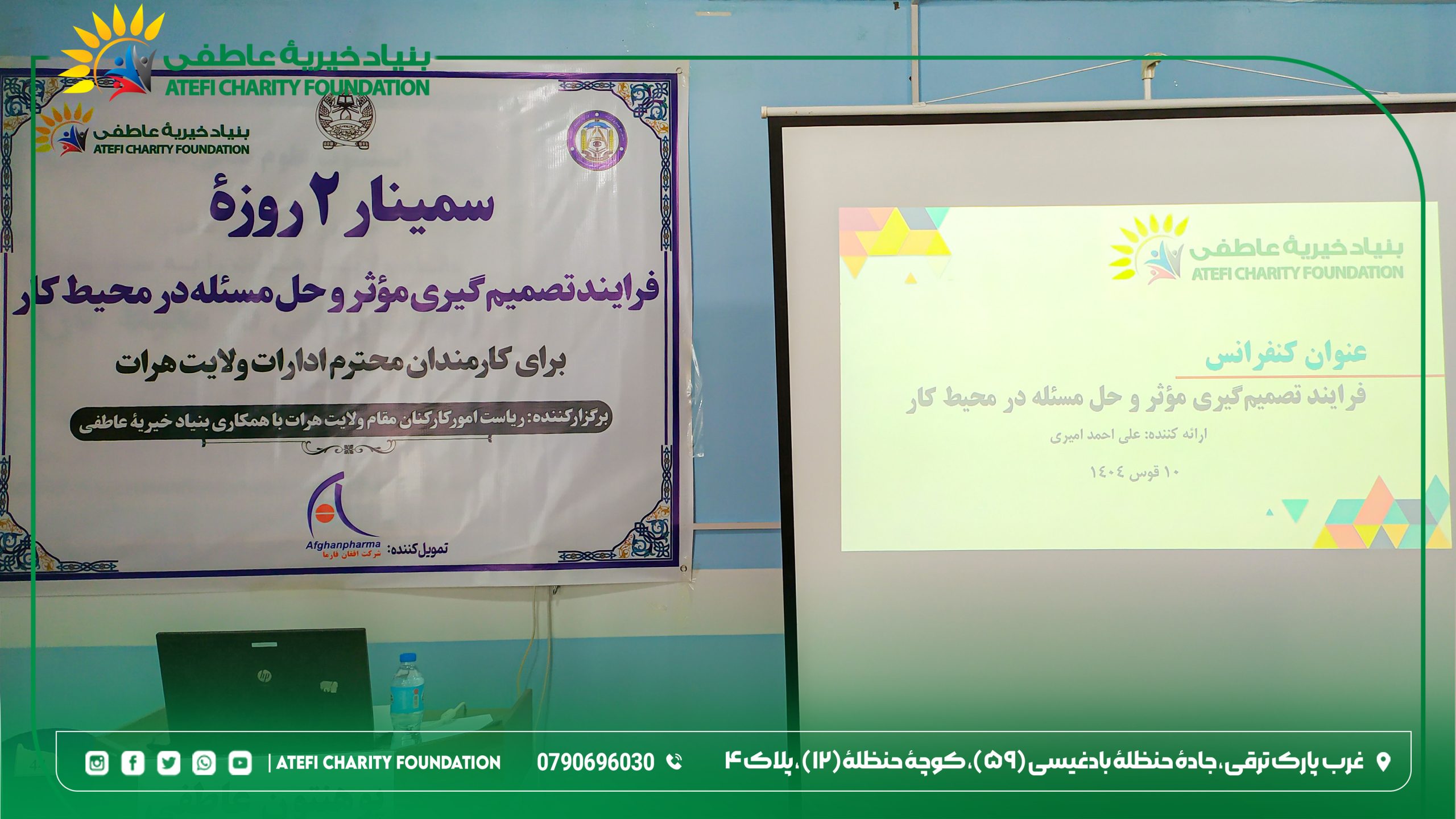 A two-day seminar titled “Effective Decision-Making and Problem-Solving in the Workplace” was held on the 01th and 02th of Dec 2025, organized by the Directorate of Staff Affairs of the Herat Governor’s Office in collaboration with the Atefi Charity Foundation.