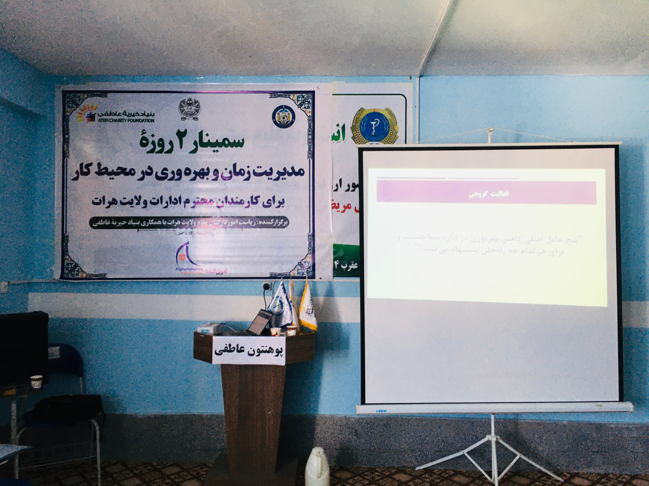 به روزهای 19 و 20 عقرب سال 1404، ریاست امور کارکنان مقام ولایت هرات با همکاری بنیاد خیریۀ عاطفی، سمینار آموزشی دو روزهای را تحت عنوان (مدیریت زمان و بهرهوری در محیط کار) برای ۳۳ تن از کارکنان ادارات امارتی ولایت هرات برگزار نمود.
